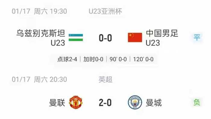 淘汰赛中,中国U23先是力克乌兹别克斯坦闯入四强,随后击败越南挺进决赛;而同一时间开赛的曼城,先是英超曼城德比0-2不敌曼联,又在欧冠赛场1-3爆冷负于博德闪耀,接连爆出冷门。